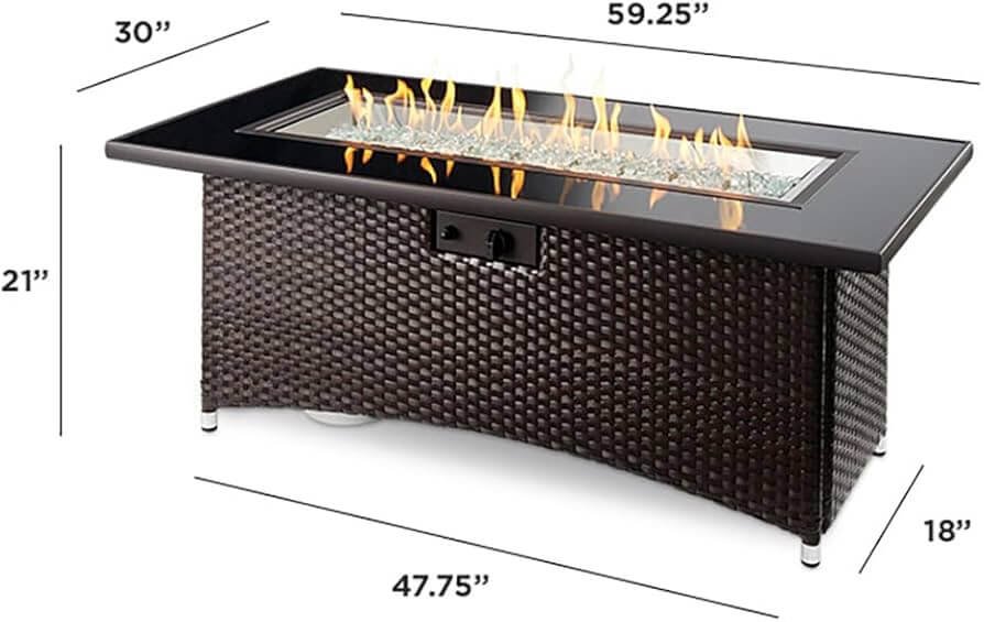 This fire table features a Black glass top and a Balsam outdoor resin wicker base. The Crystal Fire Plus Burner delivers a warm glow that’s perfect for relaxing outside. The access door conceals a standard propane tank in base